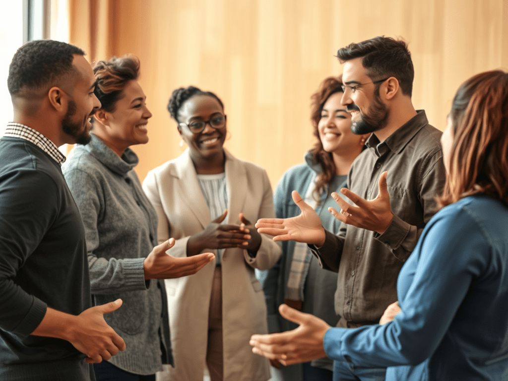 Gestos amigáveis e postura aberta são fundamentais para facilitar a interação social, pois transmitem receptividade e interesse, promovendo a integração entre as pessoas.